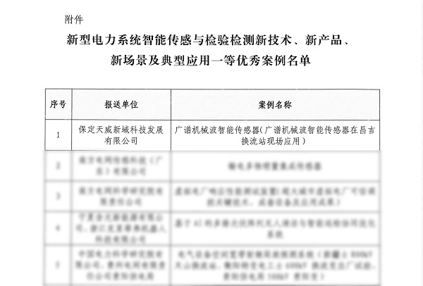 由天威新域自主研發(fā)的的廣譜機械波智能傳感器(廣譜機械波智能傳感器在昌吉換流站現(xiàn)場應(yīng)用)憑借技術(shù)創(chuàng)新突破脫穎而出,獲得“新型電力系統(tǒng)智能傳感及檢驗檢測新技術(shù)、新產(chǎn)品、新場景及典型應(yīng)用優(yōu)秀案例”一等獎。